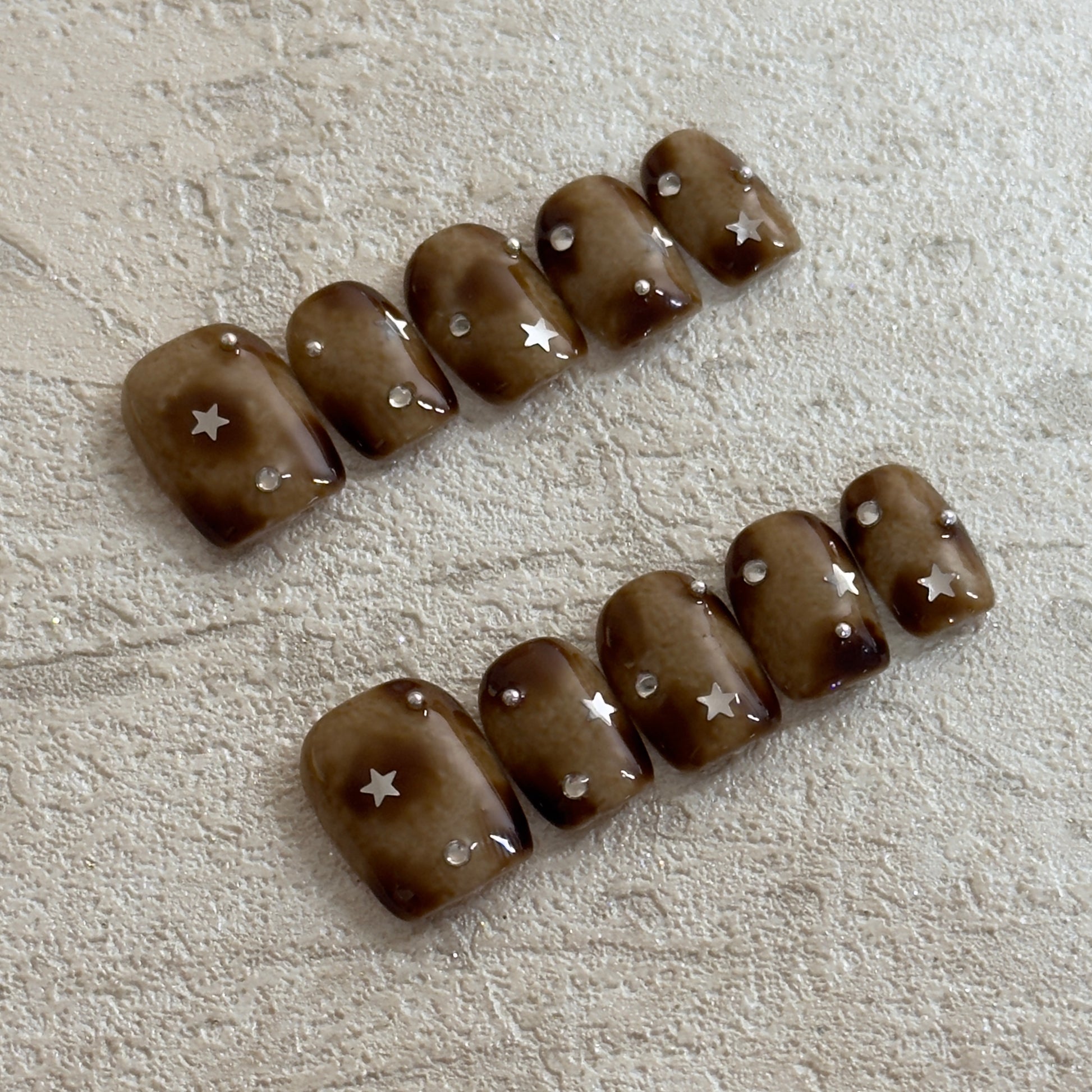 This press-on nail set features a caramel-brown milk base with subtle marbling, inspired by amber stones and hazy night skies. The translucent layers create a soft, diffused depth, while tiny star accents and crystal droplets add a delicate sparkle—never overpowering, always refined.