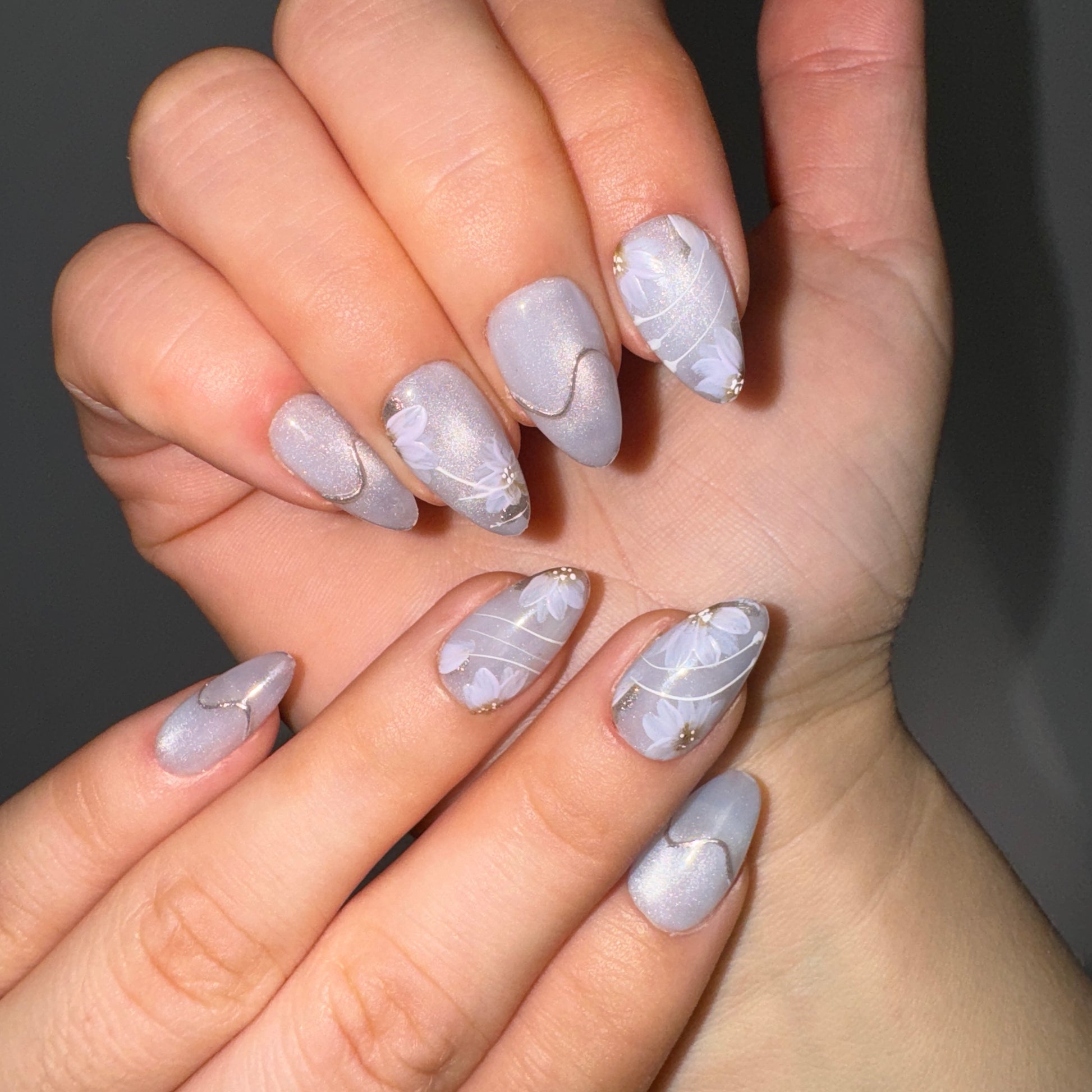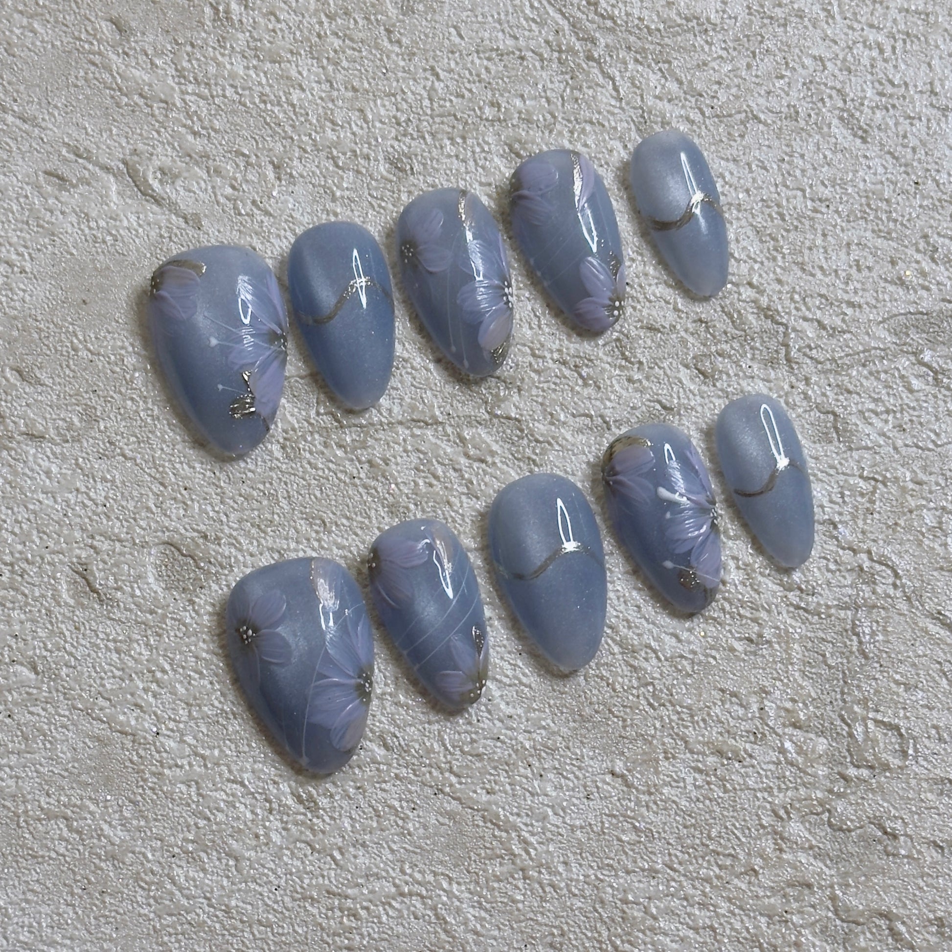 This press-on nail set features a muted blue-gray base with a subtle pearlescent glow, creating a calm and elegant foundation. Hand-painted translucent florals bloom gently across the surface, paired with fine gold accents that flow naturally along the nails.