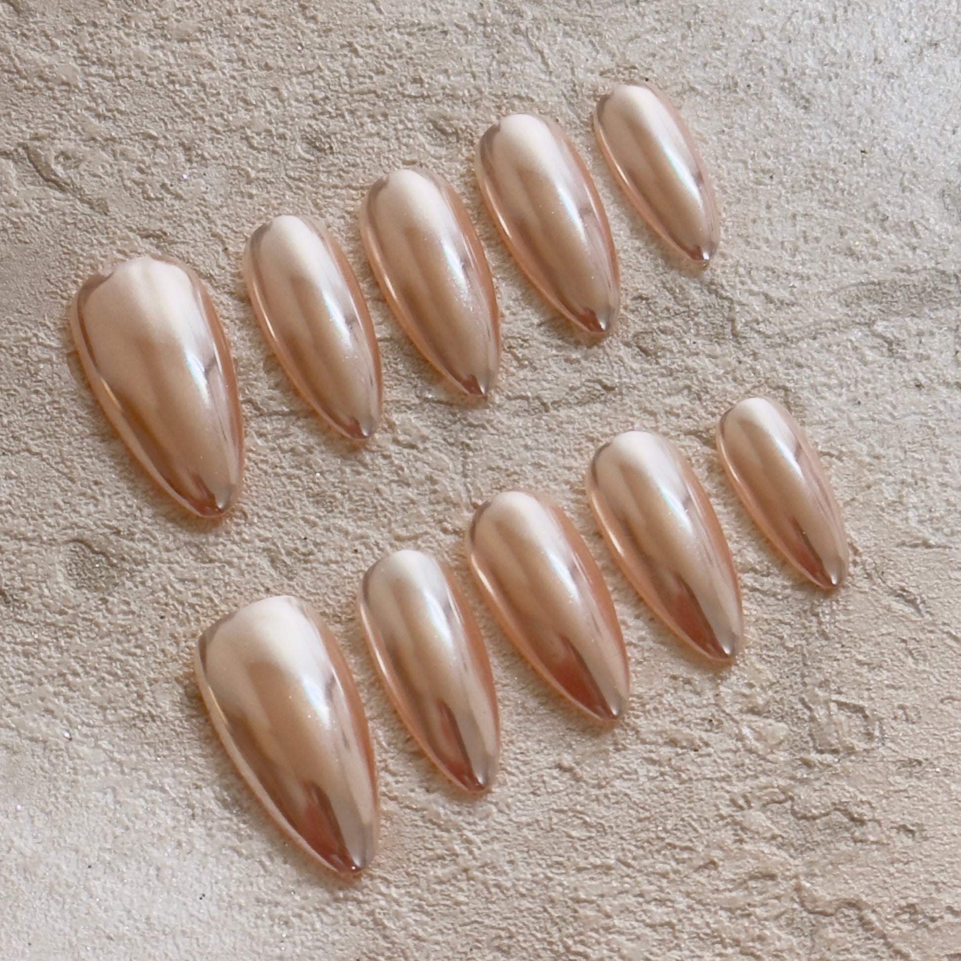 This press-on nail set features a soft champagne nude base finished with a silk-like chrome sheen. The surface reflects light gently, creating a clean, mirror-smooth glow that feels elegant rather than flashy.