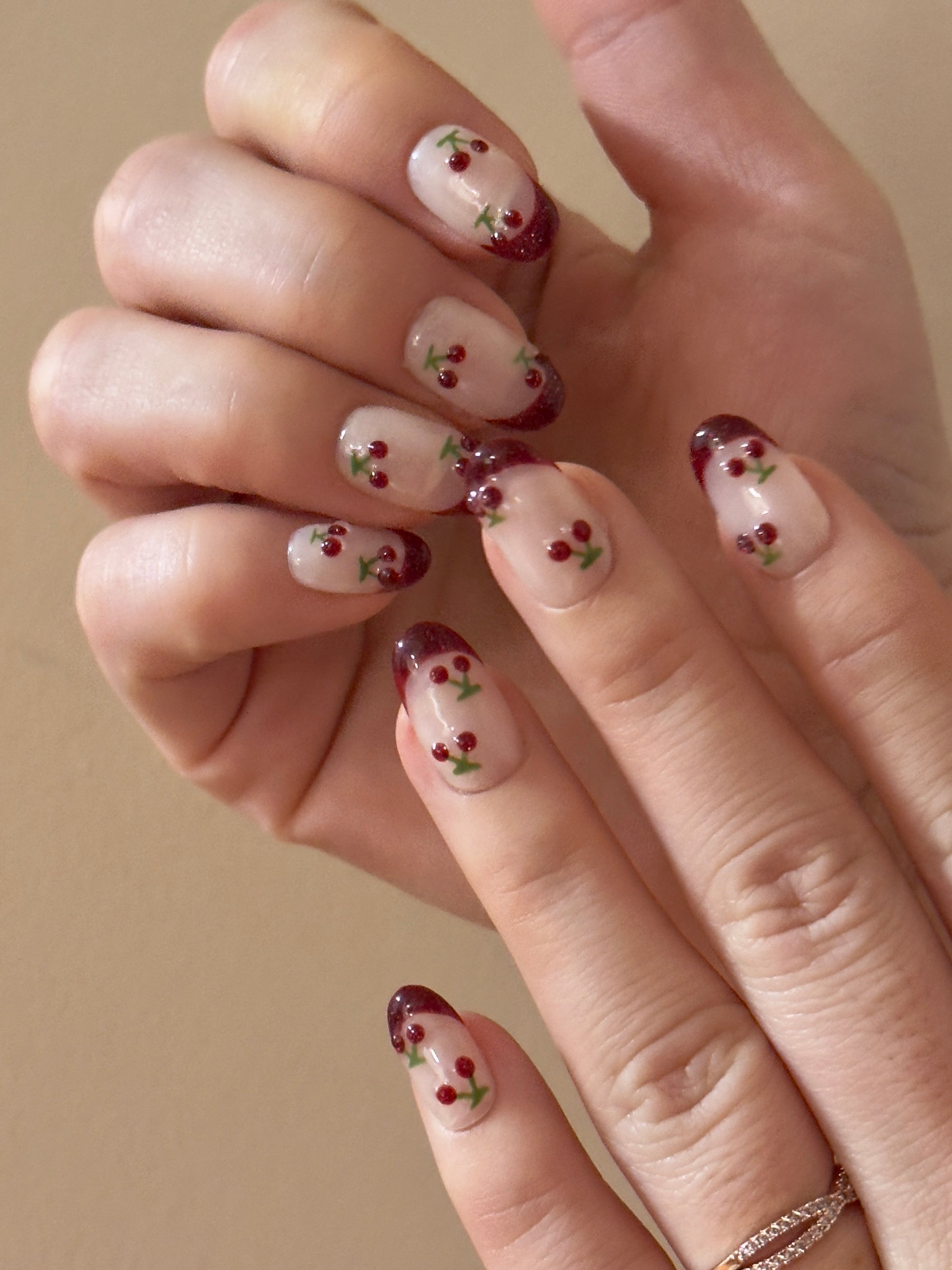 This press-on nail set features a creamy nude base paired with deep cherry-red tips, creating a fresh take on a classic French style. Hand-painted cherry details add a charming accent, bringing a touch of fun while keeping the overall look clean and balanced.