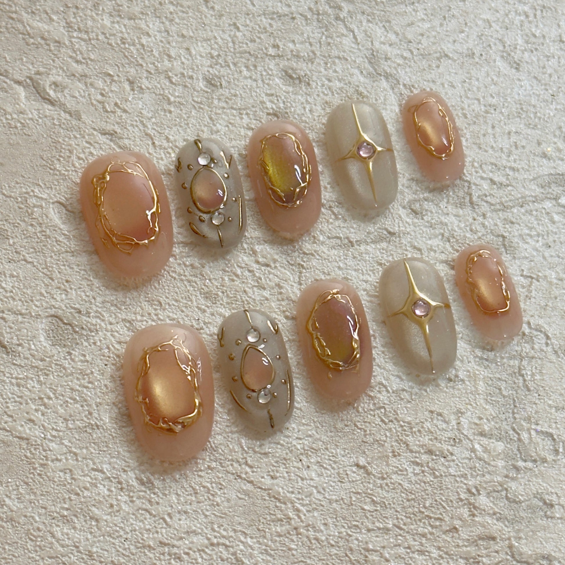 This press-on nail set features a warm nude and soft ivory base, layered with fluid gold framing details that feel organic yet refined. Each nail showcases a unique hand-drawn gold outline, creating a subtle sense of movement and depth.
