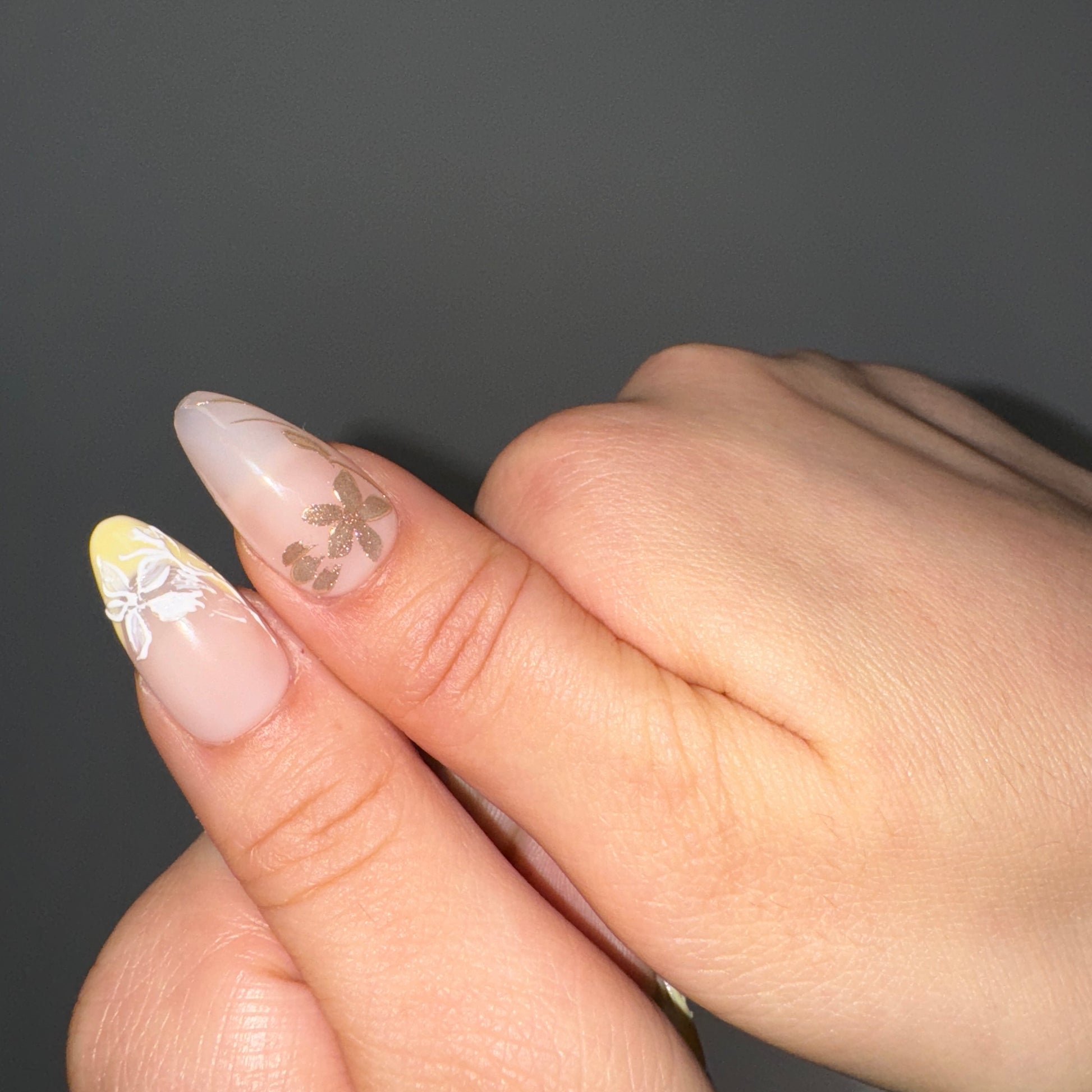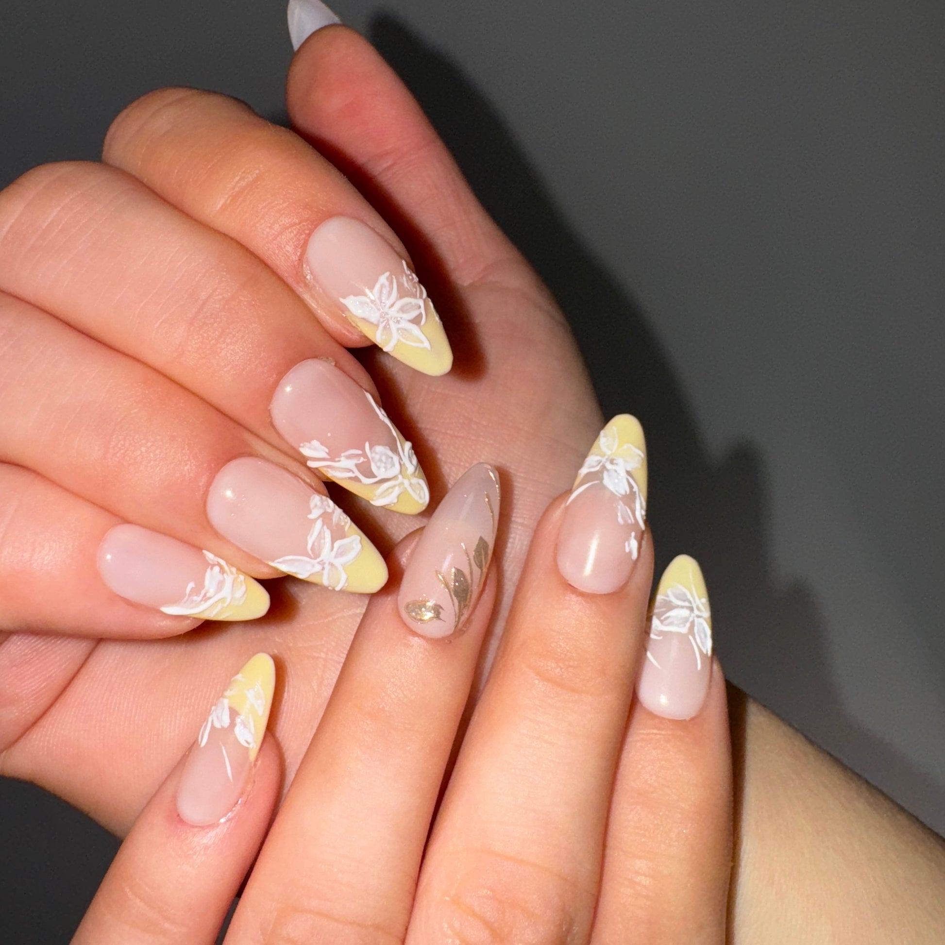 This press-on nail set features a soft nude base fading into a creamy lemon-yellow tip, creating a fresh and delicate gradient. Raised white floral details add subtle texture and dimension, while fine gold leaf accents bring a quiet touch of elegance without overpowering the design.