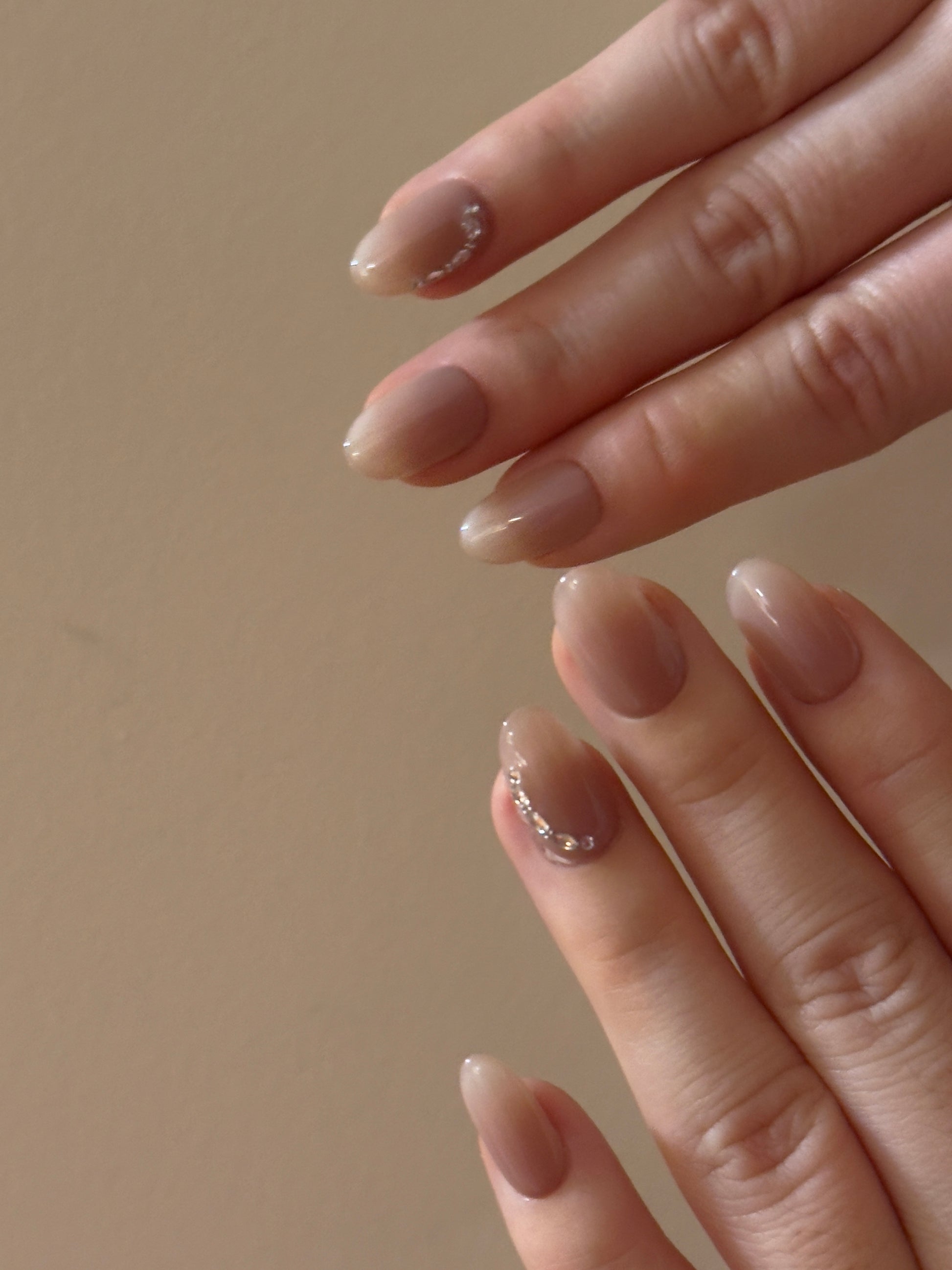 This press-on nail set features a soft nude base with a seamless, skin-like gradient that enhances the natural look of the hands. A high-gloss finish adds a healthy glow, while subtle crystal accents placed along the edges bring a refined touch of light without drawing too much attention.