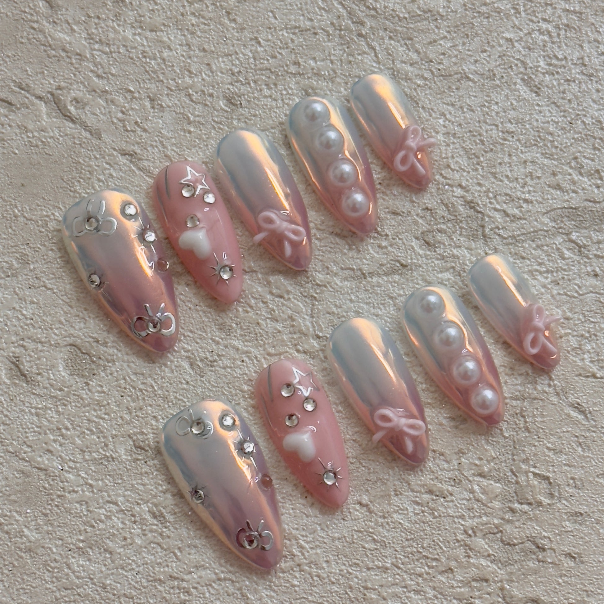 This press-on nail set features a translucent blush base blended with a subtle milky sheen, creating a light-catching finish that shifts gently with movement. The design is accented with hand-sculpted bow details, pearl embellishments, and minimal metallic charms for a sweet yet polished look.