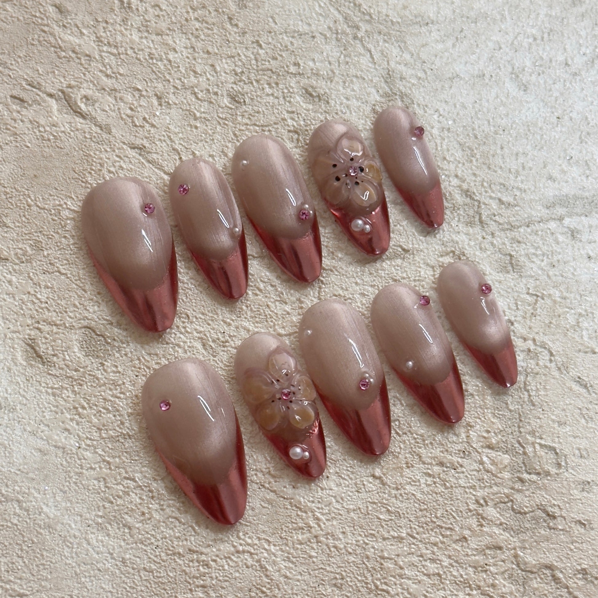 Delicate 3D floral accents bloom on selected nails, complemented by tiny pearls and pink crystal details. The design feels refined and feminine—romantic, but never overly sweet. Each element is thoughtfully placed to enhance elegance while keeping the overall look clean and wearable.