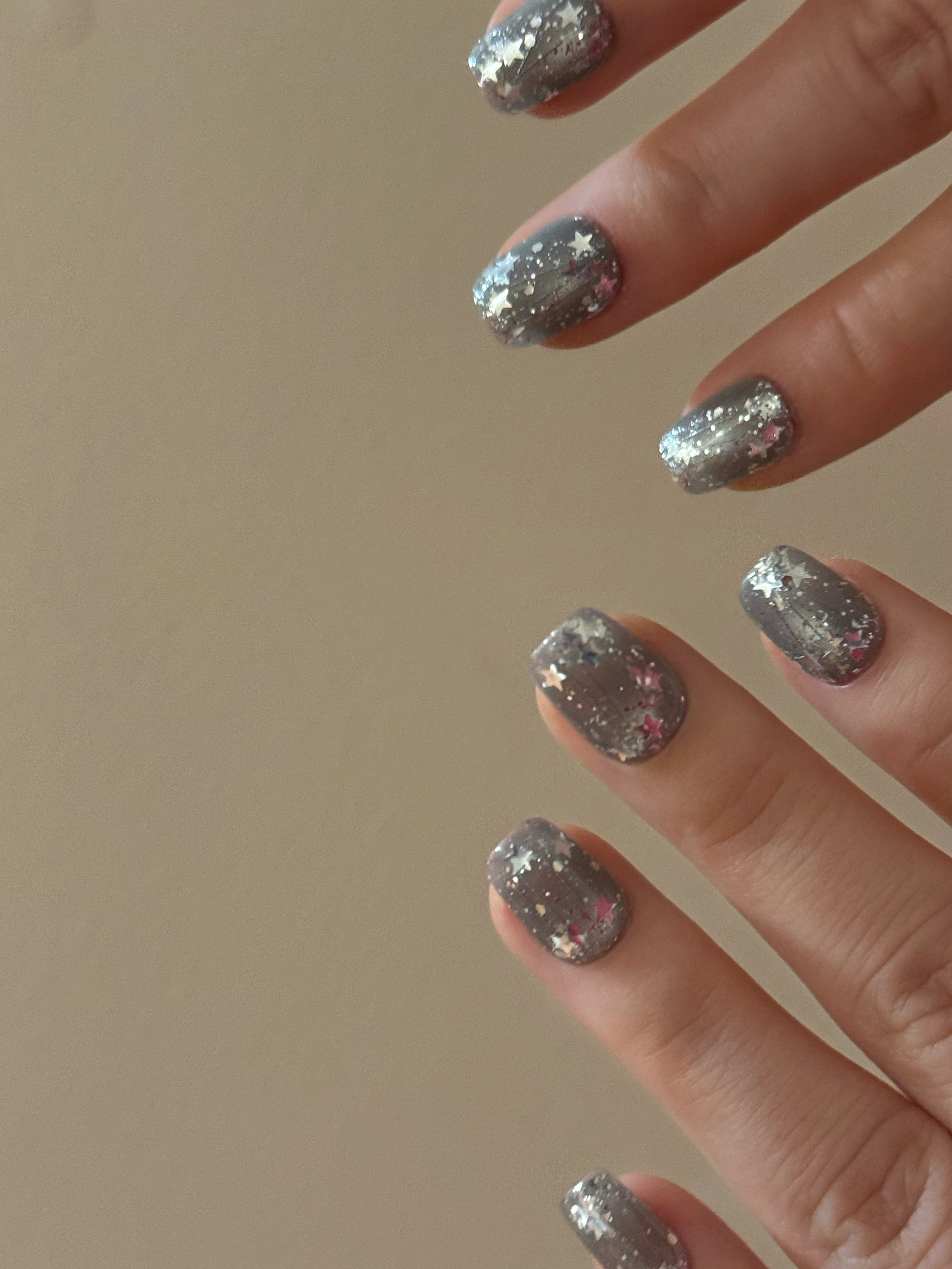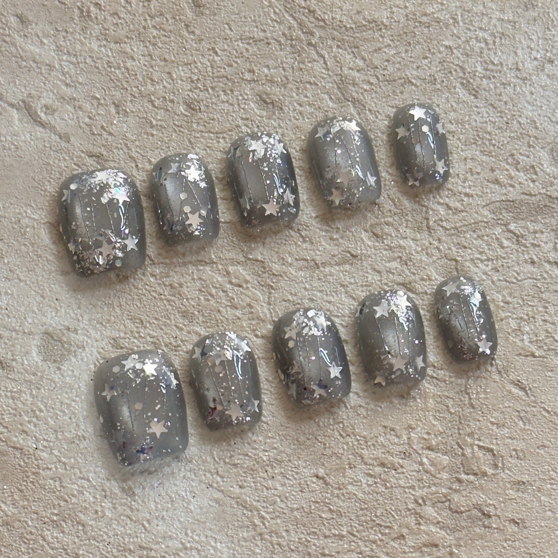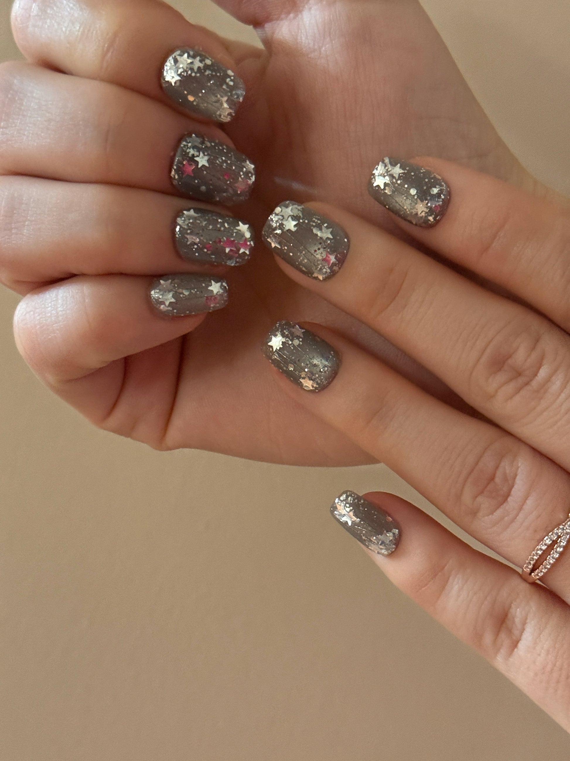 This press-on nail set features a deep grey base layered with scattered star-shaped foil and fine shimmer accents, creating a quiet night-sky effect. The glossy finish adds depth and shine, allowing the reflective details to catch light subtly from different angles.